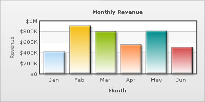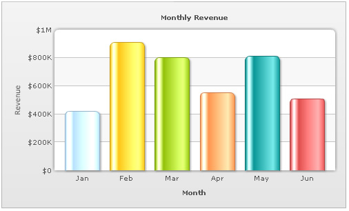 | <chart caption='Monthly Revenue' xAxisName='Month' yAxisName='Revenue' numberPrefix='$' showValues='0'> <set label='Jan' value='420000' /> <set label='Feb' value='910000' /> <set label='Mar' value='800000' /> <set label='Apr' value='550000' /> <set label='May' value='810000' /> <set label='Jun' value='510000' /> <styles> <definition> <style name='myBevel' type='bevel' distance='3'/> <style name='myShadow' type='shadow' angle='45' distance='3'/> </definition> <application> <apply toObject='DATAPLOT' styles='myBevel, myShadow' /> </application> </styles> </chart> |