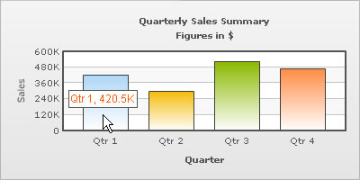 | <chart caption='Quarterly Sales Summary' subcaption='Figures in $' xAxisName='Quarter' yAxisName='Sales' showValues='0' > <set label='Qtr 1' value='420500' /> <set label='Qtr 2' value='295400' /> <set label='Qtr 3' value='523400' /> <set label='Qtr 4' value='465400' /> <styles> <definition> <style name='myToolTipFont' type='font' font='Arial' size='12' color='FF5904'/> </definition> <application> <apply toObject='ToolTip' styles='myToolTipFont' /> </application> </styles> </chart> |