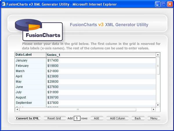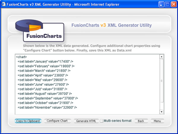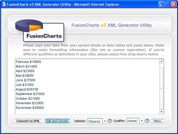 | After editing your data, you can now click on "Convert to XML" button to generate the XML and finally chart. |
