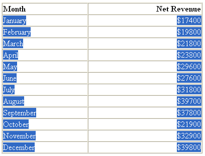 If you've your data in boring HTML tables, you can quickly and easily spice them up with charts, at just the click of few buttons. Here, we'll show you how. The XML Generator Utility allows you to copy data from HTML tables and convert it into XML too. Let's quickly see an example. We'll again get back to our Monthly sales summary example. Let's consider that we've this display present as an HTML table and we now need to convert it to a chart. |