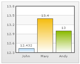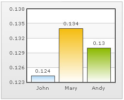 Similarly, if you had data as 0.12342, 0.134 and 0.13, and you set decimals as 3, FusionCharts would output 0.124, 0.134 and 0.13 respectively. Note that even though we've set decimals to 3, FusionCharts now doesn't forcibly add the 0 padding to 0.13 to form 0.130, as the trailing 0 is un-necessary. However, if you want your numbers on the chart to have trailing zeroes too, you can set <chart ... forceDecimals='1' > and now the numbers would show as 0.124, 0.134 and 0.130 respectively. Shown below are examples: |