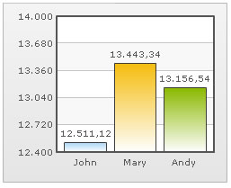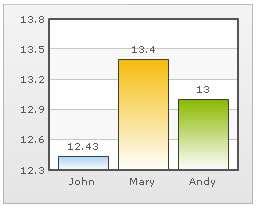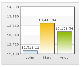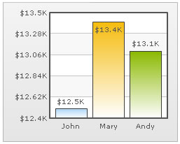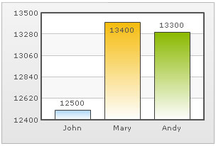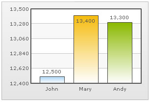 In the above image, the data for chart is 12500, 13400 and 13300. FusionCharts automatically formats the number scaling to convert to K (Thousands) & M (Millions). If you do not wish to truncate numbers in this manner, just use: <chart formatNumberScale='0'..> When you now view the chart, you'll get the following output: |