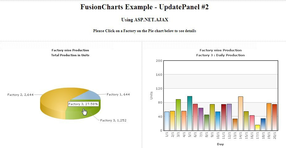 | We modify the sample above to insert two charts. One on the left, a pie chart with summary data, showing total production of each Factory in each slice. On clicking a slice, i.e. selecting a Factory, another chart will show up in an UpdatePanel. This chart, a Column2D chart, like the previous example will show the the details of the slected Factory. |